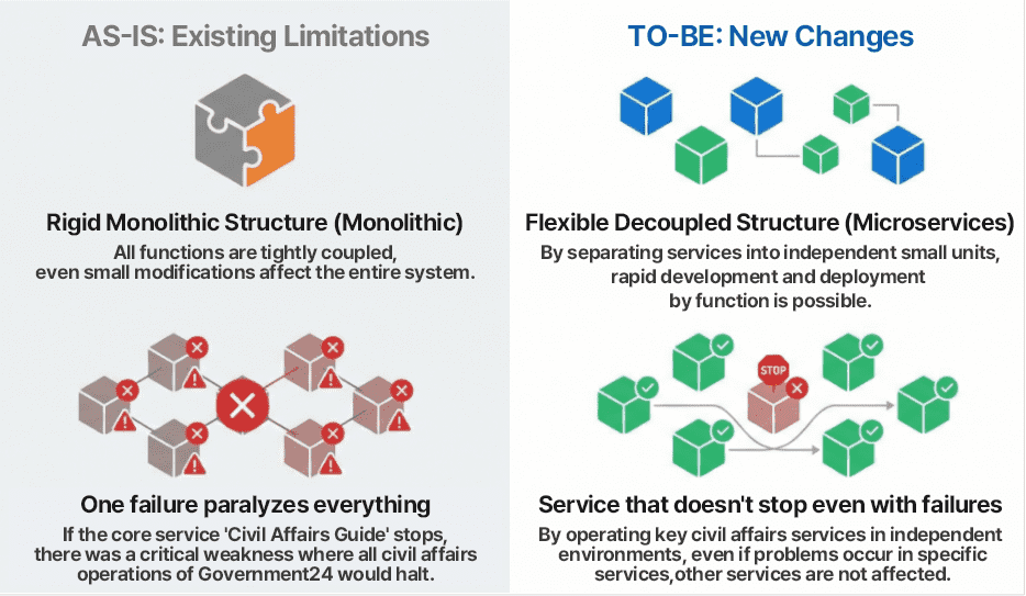 At the center of this effort is the Government24 Complaint Portal, a public portal that is closest to citizens' daily lives. Government24, which must maintain stability even when faced with heavy user traffic, set the goal of automating system capacity expansion up to 7.6 times and reducing service downtime by 81.6% and processing speed by 36.7% through this transition. This technological leap will ultimately provide citizens with a solid foundation for faster and more comfortable digital government services.